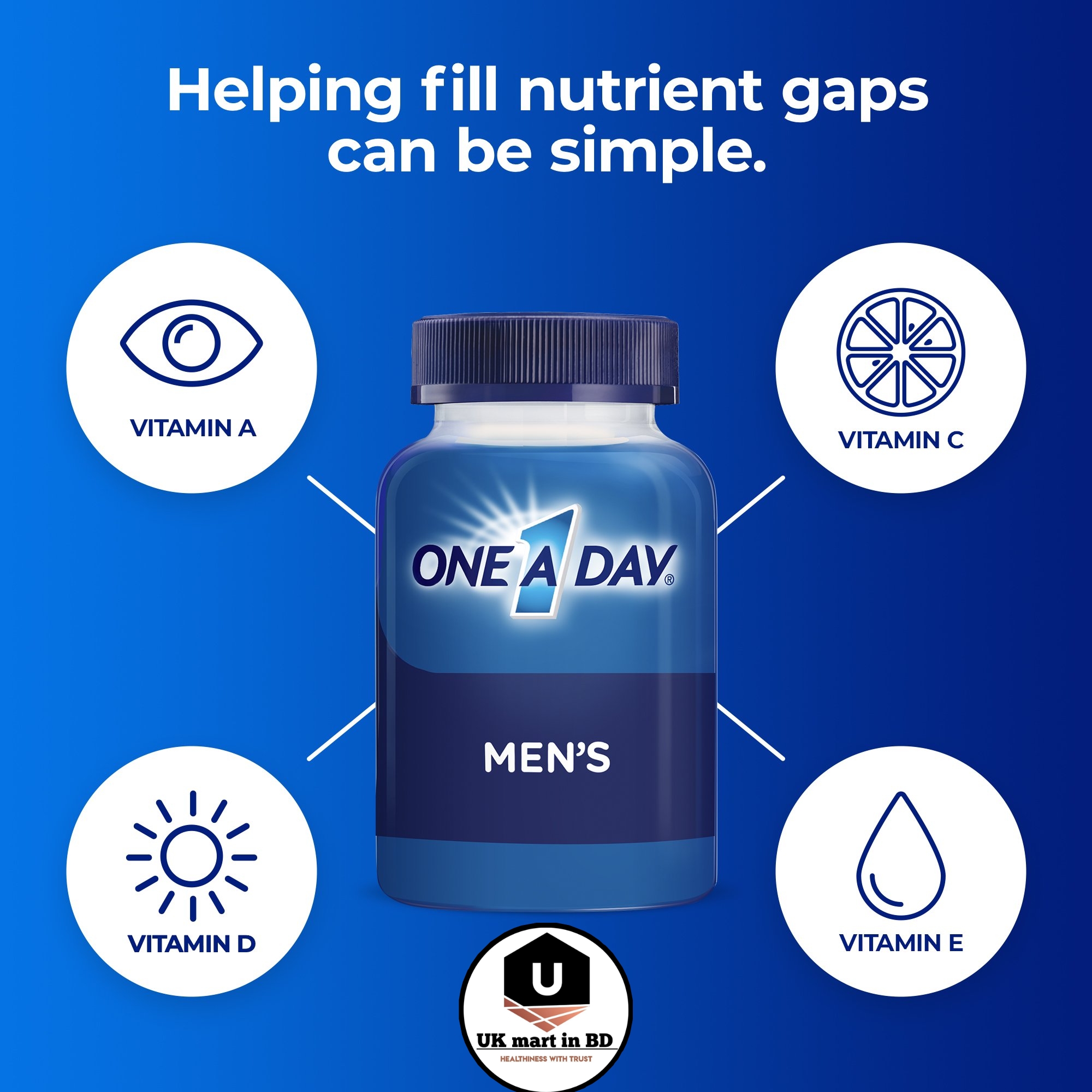 One A Day Men’s Health Formula Multivitamins offer a wide variety of key nutrients in a single tablet. One A Day Men’s Health Formula is ideal for men who are proactive about their health. This daily multivitamin is specially designed to address key health concerns of men. This easy to take tablet contains Vitamins A, B6, B12, C, D, E, and K, Riboflavin, Thiamin, Niacin, Folic Acid, Pantothenic Acid, Zinc, Manganese, Biotin, Magnesium, Copper, Lycopene, Calcium, Selenium, and Chromium. One A Day Men’s Health Formula Multivitamin is Formulated to support:**** heart health*, healthy blood pressure**, immune health, healthy muscle function, and physical energy*** by helping convert food to fuel. One A Day Men’s Health Formula Multivitamins are free of gluten, wheat, dairy, artificial colors, and artificial sweeteners. Adult men should take one tablet daily with food. One A Day Multivitamins can provide nutritional support that you and your family may need.
